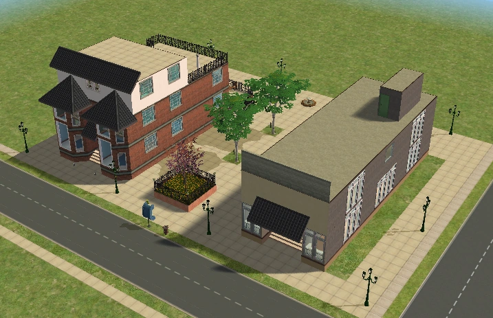 El edificio de dos plantas tiene una tienda de ropa y baños en el primer piso, y hay sofás cerca de la entrada. La segunda planta está abierta en el centro y está prácticamente vacía, aunque tiene una chimenea y algunos asientos para los Sims. La primera planta del otro edificio tiene una mesa de billar, un revistero y expositor tecnológico Vendífono. También tiene una chimenea, y hay un bonito sofá y un sillón cerca de ella. Un patio en la parte trasera tiene una mesa de ajedrez y una barbacoa. La segunda planta es otra tienda de ropa, que aparentemente está diseñada para ser más exclusiva. No hay cajero en esa planta, así que los Sims que compren ropa allí tendrán que llevarla al cajero de la primera planta. La tercera planta tiene una cafetería y una terraza en la azotea.