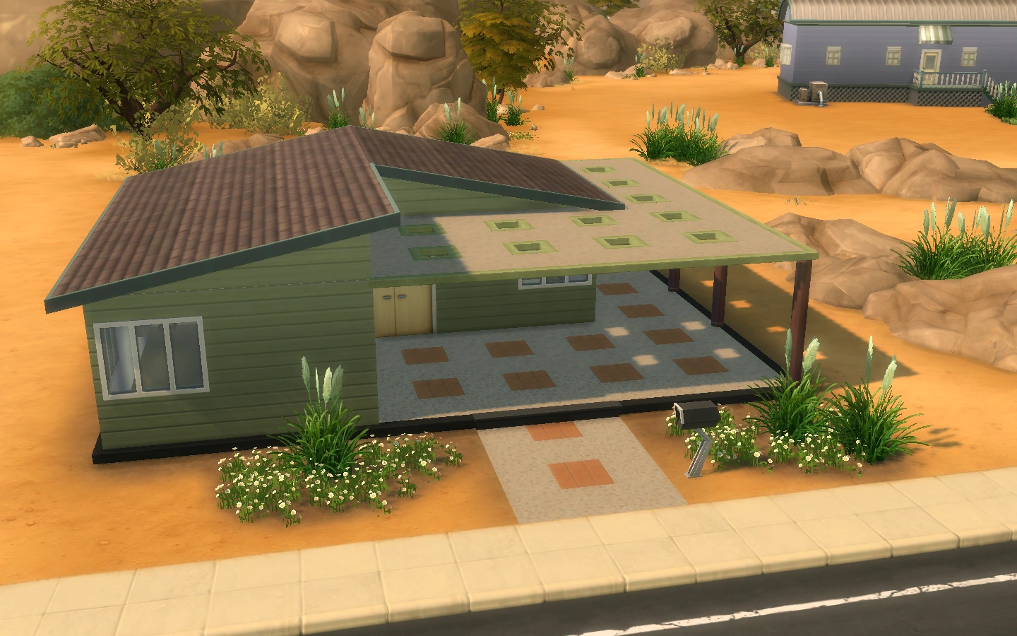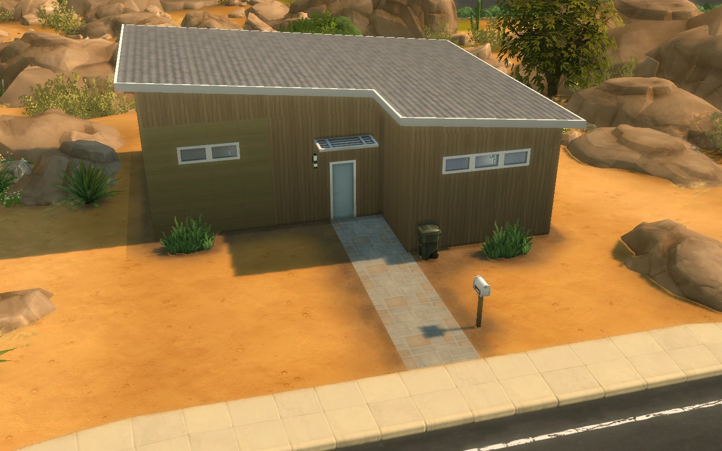Het Strandhuis is de enige lege kavel in Bedrock Strait. Het is de perfecte plek voor je sim om een starterswoning te bouwen. Achter de kavel bevindt zich een beek met een visplek.