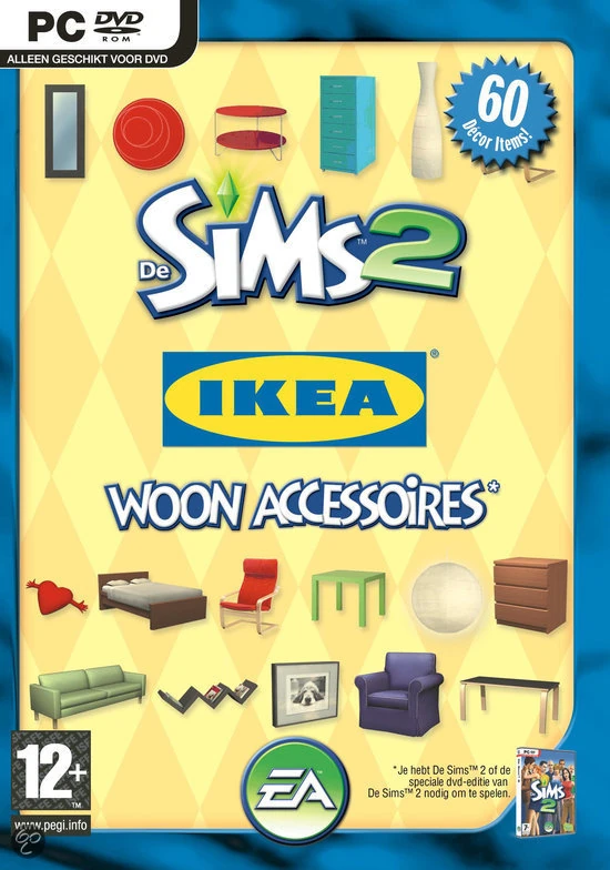 Dit nieuwe pakket voor De Sims 2 bevat hebbedingen van IKEA® voor de belangrijkste ruimtes in de huizen van je Sims, zoals de slaapkamer, woonkamer en werkkamer. Geef de huizen van je Sims een volledige make-over met nieuwe meubels en accessoires gebaseerd op de stijlvolle collectie van IKEA®! Laat het droomhuis van je Sims werkelijkheid worden! Of ze nu verlangen naar een trendy, ruime werkkamer, een chique woonkamer of een gezellige en rustgevende slaapkamer, het ligt allemaal binnen handbereik met De Sims™ 2 IKEA® Woon Accessoires. Stem de woonomgeving van je Sims volledig af op hun persoonlijkheid. Maak een keuze uit nieuwe banken, bedden, tafels, tv-meubels en planken in allerlei kleuren en patronen voor een uniek interieur. Je zet de puntjes op de i met populaire IKEA® kunstwerken, spiegels, verlichting en vazen. Je wordt een topinterieurdesigner voor je Sims dankzij de inspirerende en moderne stijlen van IKEA!