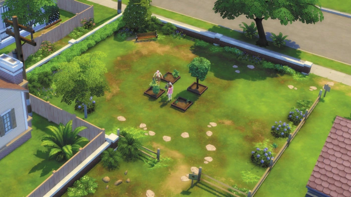 Achter de kavel van de Essentiële Tuin bevindt zich een gemeenschappelijke tuin waar al planten en bomen groeien. Dit is een goede plek voor Sims om de tuiniervaardigheid te leren en ontwikkelen als ze niet genoeg ruimte in hun eigen tuin hebben.