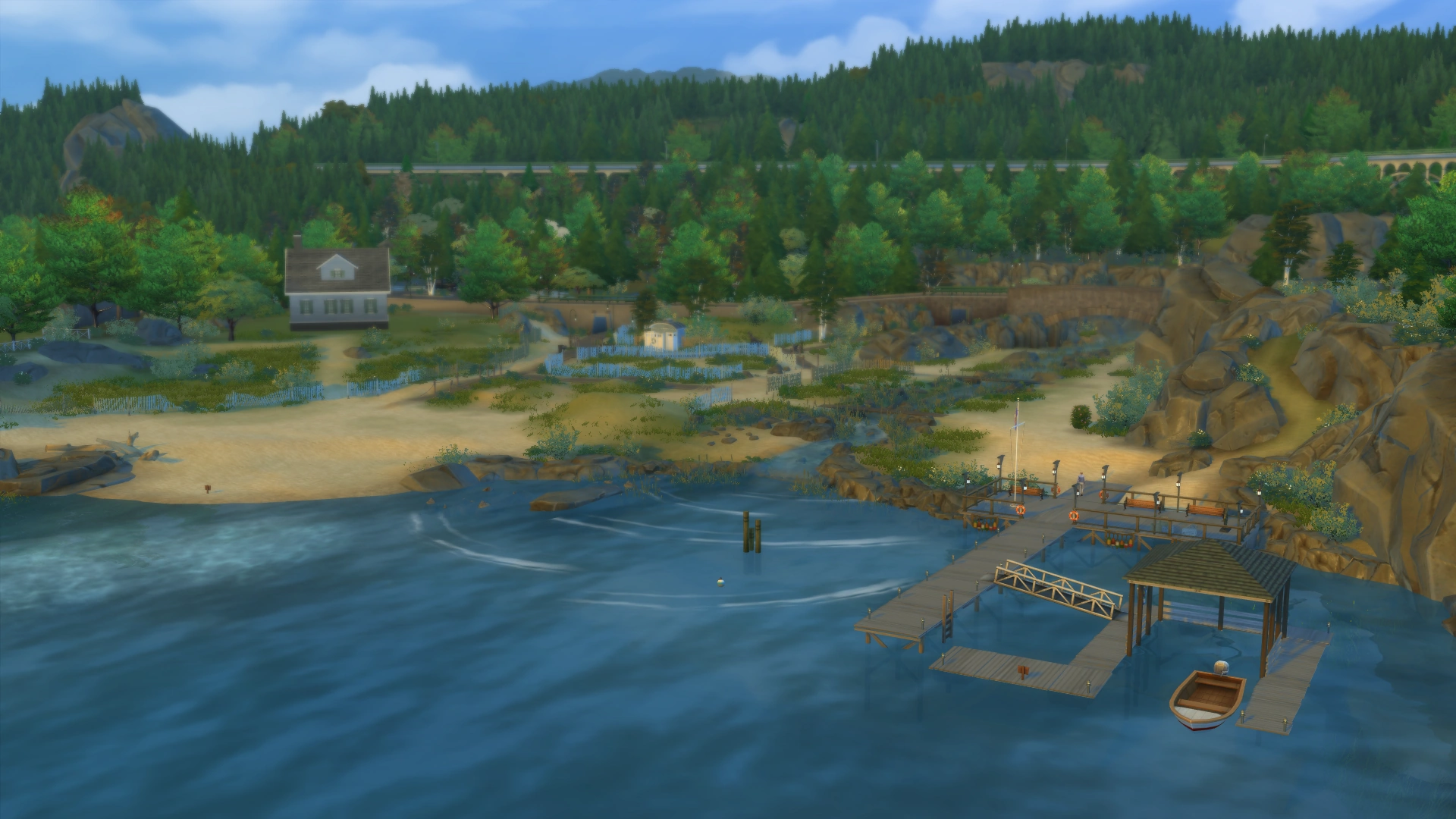 Aan de overkant van het strand ligt een kleine beek, naast de twee lege kavels van de buurt. Over de beek loopt een snelweg, waar Sims onderdoor kunnen gaan om toegang te krijgen tot het Achtergelegen Stekkie, dat zich op een heuvel bevindt. Naast het Achtergelegen Stekkie ligt een klein grasveld met een vijver waarin zich een visplek bevindt.