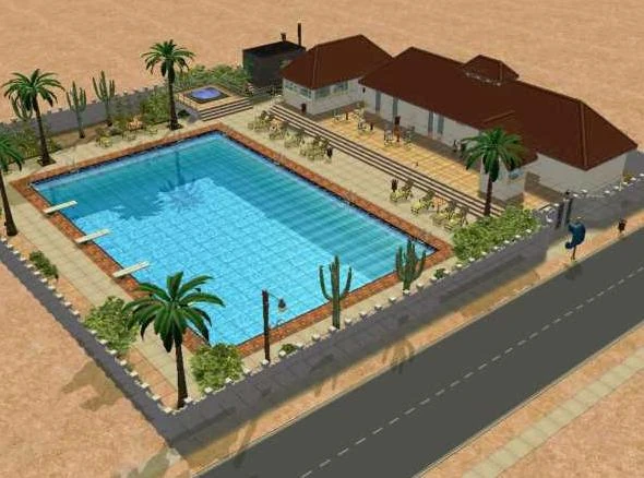 Przy wejściu znajduje się mała budka z kasą.Jest ona jednak na pokaz, ponieważ wejście na basen nic nie kosztuje. Za budką znajduje się sklep spożywczy.