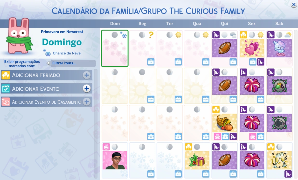 O calendário permite planejar Eventos Sociais antecipadamente, até duas semanas de antecedência. Ele exibe, também, horários da escola e de carreiras, futuros aniversários, fases da lua, festivais, feriados e clima.