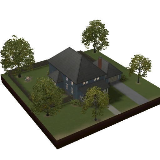 Na fachada, encontram-se vários florarbustos e arbustos chifres-de-veado, assim como duas latas de lixo e uma garagem coberta com uma vaga de estacionamento e bancadas. Aos fundos, há um quintal cercado com mais da vegetação supracitada, mesa de pingue-pongue, barril de suco e mesa de jantar com seis cadeiras.