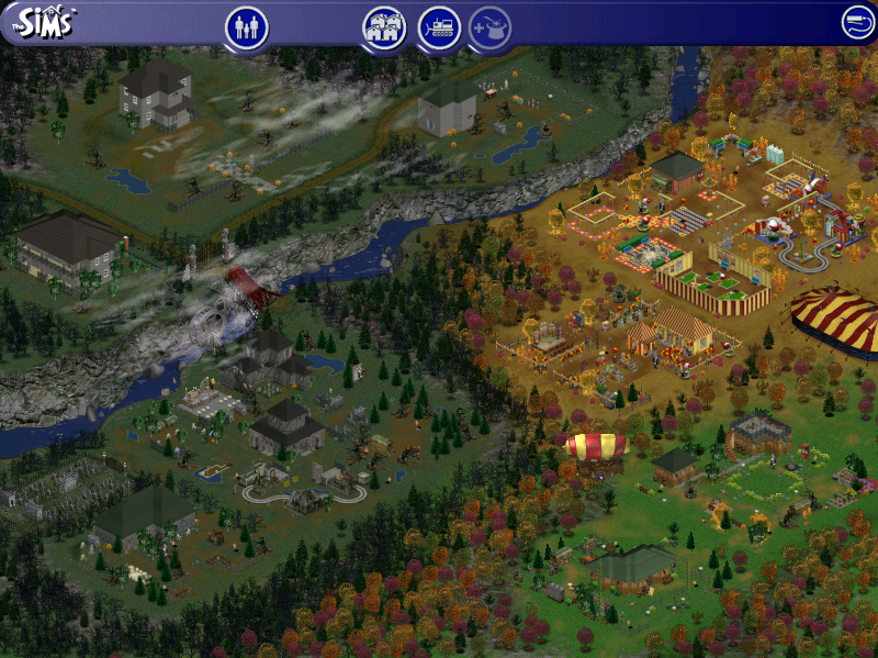 O jogo é focado em vizinhanças, isto é, uma região constituída de lotes residenciais e comunitários[TS:EM][TS:OBVP]. Todos os lotes residenciais servem de habitação para um núcleo de Sims. Inicialmente, a única vizinhança disponível era a Vizinhança 1, que contém dez lotes e tem duas famílias como habitantes, com mais três delas estocadas. Os primeiros pacotes de expansão trouxeram a Vizinhança 2, que, apesar de terreno idêntico, contava com novos lotes e uma família nova; também foram introduzidos outros clones da Vizinhança 1 (chamados de Vizinhança 3, Vizinhança 4, etc.), que estão completamente desertas e convidam o jogador a habitá-las. O Bicho Vai Pegar, quinta expansão do jogo, inovou ao expandir consideravelmente a visão da vizinhança original, introduzindo mais de vinte lotes, várias famílias novas, além de trazer os lotes comunitários, até então restritos à Cidade[TS:EM], a uma vizinhança residencial. Esta vizinhança aprimorada recebeu o nome de Cidade Velha. Além da Cidade Velha, Num Passe de Mágica, sétima e última expansão da primeira geração, introduziu a Cidade da Magia, onde estão localizados três lotes residenciais que podem ser comprados com simoleons e moedas mágicas.