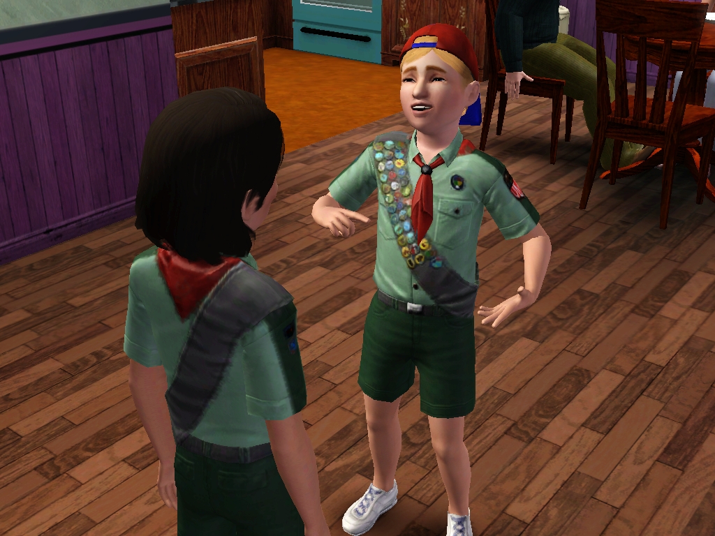 Children who are enrolled in scouting will learn the fishing skill. In addition, the child Sim will learn how to tie a knot and salute, both of which are interactions that may be performed on any Sim after learning them. They earn badges which they can show off to other Sims or use as wall decorations. Boys and girls appear to share the same scouting regiment.