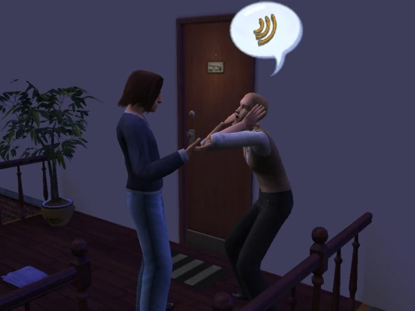 When neighbor noise is produced, all sleeping Sims in the apartment will wake up and everyone will gain either an angry or a tense moodlet. Sims can either knock or pound on the neighbors door to make them answer. Sometimes the neighbor will not hear a Sim knock on their door, but will react immediately when a Sim is pounding on it. When a neighbor answers the Sims complain, they will either accept it or just shrug it off, both reducing the relationship between the neighbor and the complaining Sim.