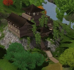 The base camp in Shang Simla has several floors, it is elevated into the hillside. There are bookshelves where Sims can read rare books without purchasing them. It has an excellent view of the Dragon Cave, and is located near the river.