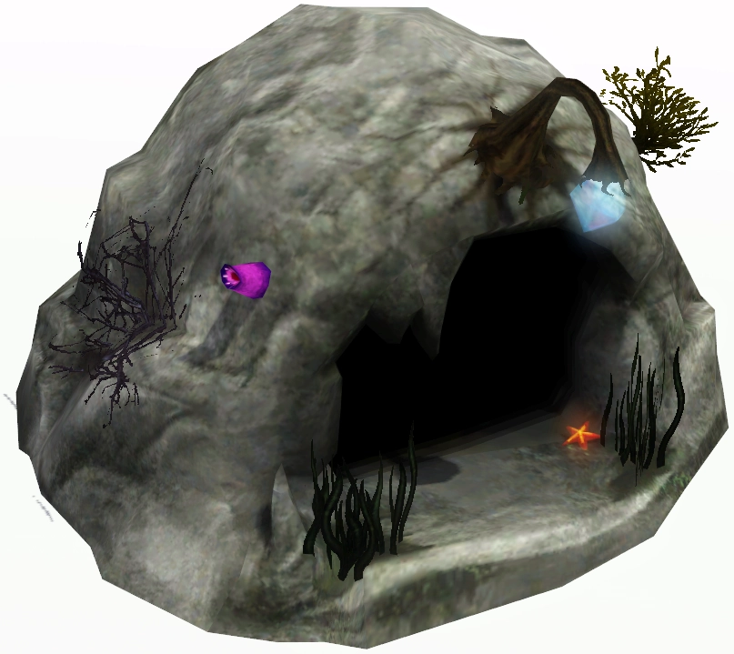 An underwater cave is a large cavern located at the bottom of the ocean in the diving areas of The Sims 3: Island Paradise. The underwater cave is one of the things a Sim can interact with while scuba diving. Sims can explore an underwater cave from 60 to 90 minutes, and while exploring the cave, there is a 45% to 95% chance of finding something, depending on the scuba diving skill. It could be some metal, a gem, a shell, a message in a bottle, a magic gnome, or a scuba magic gnome. When exploring, there is also a 35% chance of finding an air pocket inside the cave.