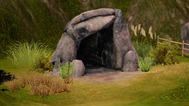 The cave can be used as shelter from rain. Within the cave lies a primordial drawing of llamas, as well as the Ancient Door, which requries the Llama King's Crown to unlock. Upon opening the door, Sims will be granted access to Hidden Lagoon, one of the secret areas in the game.