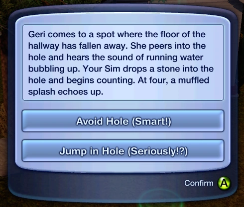 As in other games, some choices will have negative effects. For example, when Help Muggers fails, the Sim will be arrested (unless he or she a Monarch) and will get a Major Laceration buff. As in The Sims 3, there is no ignore button.