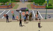 Sims can start a protest with the "Me Too!" Megaphone if University Life is installed, and they do not need to be at city hall. Starting and participating in protests boosts a sim's Rebel Social group Rank. With a high Rebel social group rank a sim can start a hunger strike or a rowdy protest. During a hunger strike all protesters will get a -5 moodlet and will occasionally sneak a taste of a snack. Meanwhile, during a rowdy protest sims may get into fights with each other.
