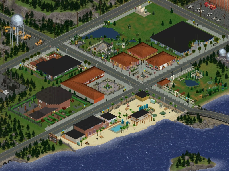 - 29 Main Street, SimCity Beach - At the beach, there are a couple of fish ponds with a rental shack, a BBQ grill, a hot dog stand, a small bar, and a small shop where Sims can get new swimsuits. Of course, they can't go in the sea.