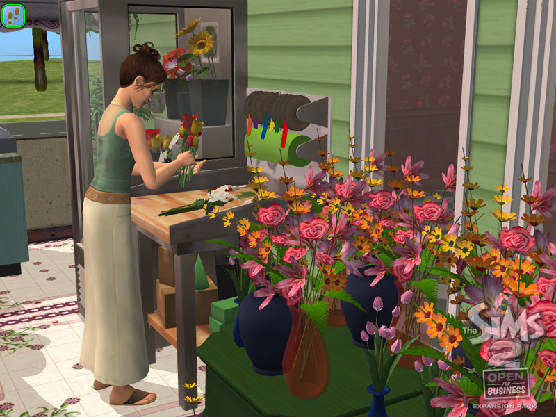 In The Sims 2: Open for Business, the talent badge is attained by arranging flowers using the "That Smells Great!" Floral Workstation. As Sims craft more flowers, they will gain experience and eventually achieve the Talent Badge. Higher level talent badges will enable Sims to arrange the flowers faster. It also unlocks more types of flower arrangements that can be crafted. These crafted flowers can be sold in a florist business. Higher Creativity skill will make Sims earn this badge faster. If The Sims 2 Freetime is installed, performing this activity will raise enthusiasm for the Arts and Crafts hobby.