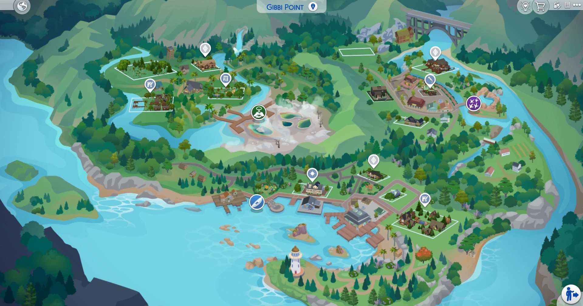 Gibbi Point[1] is a world shipped with The Sims 4: Adventure Awaits. The world is expansive and rich with lore for Sims to uncover. Players can find the Adventure Story Map at Jellyfish Junction to learn about quests and dive deeper into Peculiar Plumbird's history. It is a getaway destination filled with activities and facilities for Sims of all ages, and each neighborhood features public playgrounds for children to enjoy and embrace their childhood. The world also hosts a number of festivals where Sims can meet other townies and discover even more about the region's unique heritage. The endangered Plumbird can occasionally be spotted wandering somewhere in the world, though sightings are extremely rare.