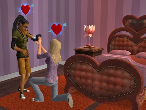 The More Romantic than You Double Bed was introduced in The Sims 2: Apartment Life. The bed has a heart-shaped wooden head and foot. Unlike the rest of the single and double beds in the game, this bed comes with only three choices of sheets. The three sheet choices are red, pink, or navy blue. This item is also in The Sims for Xbox.