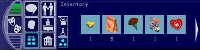 The Urbz: Sims in the City includes an inventory feature that is divided into 3 sections (first for objects, second for build items, and third for Power Socials). The Urbz: Sims in the City only allows 12 different objects in each section of the inventory, and up to 99 of the same item. Having two different colors of the same object will count as two objects instead of one.