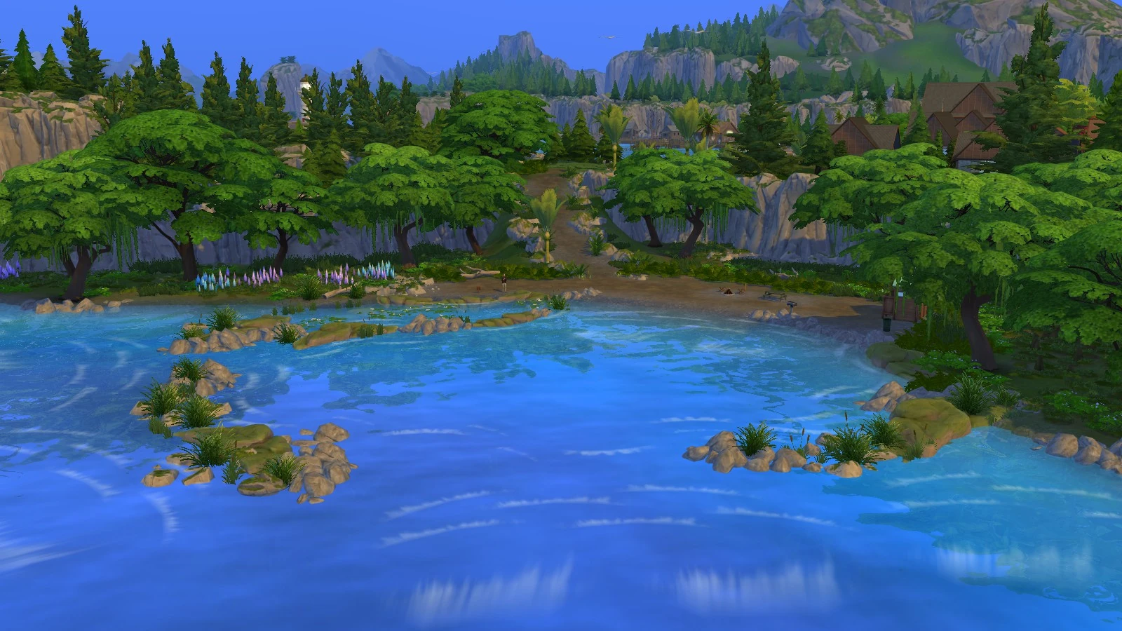 Underlight Bay is a scenic bay located at the northern part of the peninsula where Sims can swim, fish, or enjoy the outdoors with a campfire and grill. It is home to the Glow and Flow Festival and is the prime location to witness the auroras at night, if the neighborhood eco footprint is green[TS4:EL].
