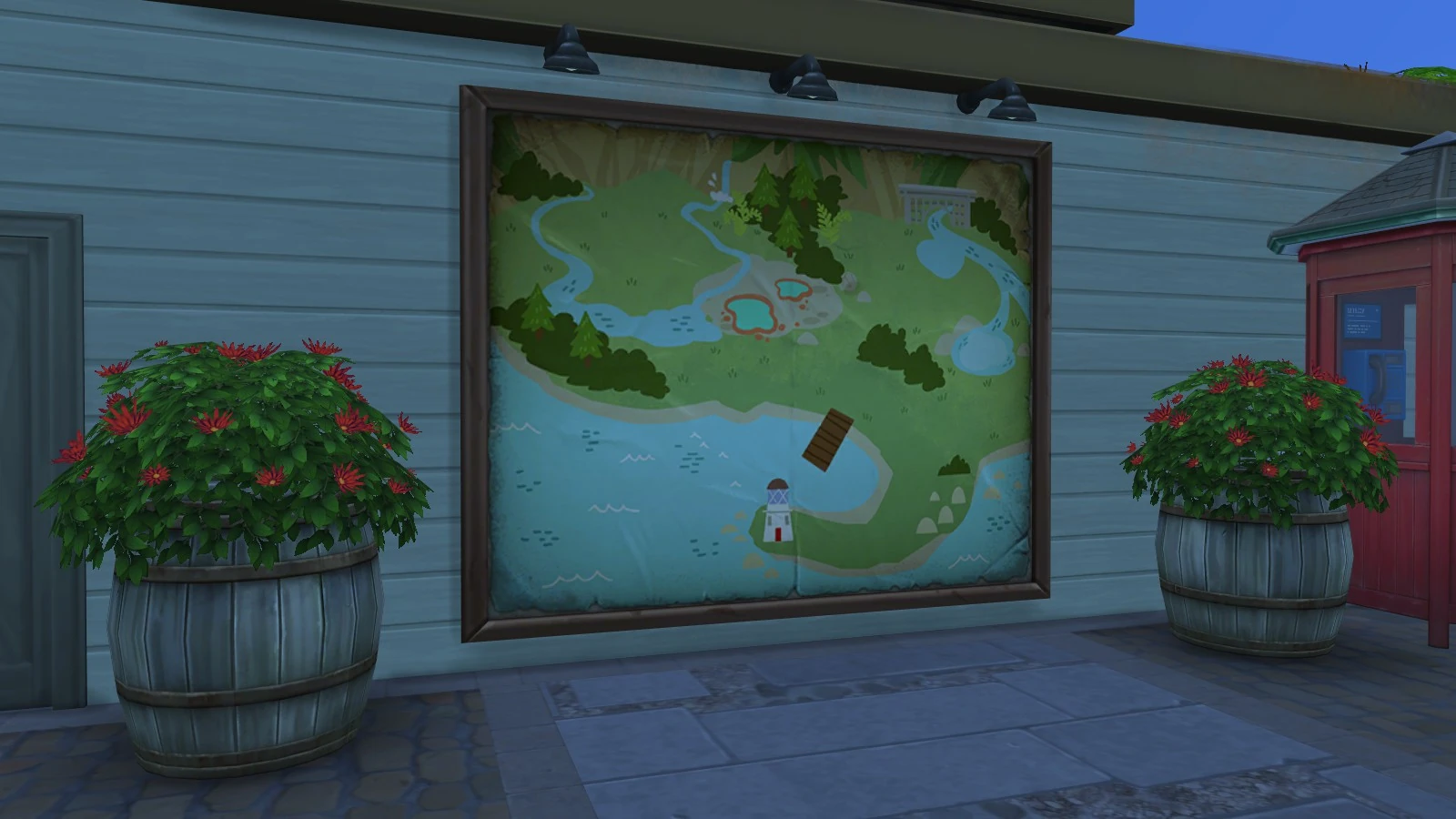 A small stone quay stretches out from the coast, featuring a brick painting of a jellyfish just south of the small garden. A public easel is placed there for Sims to paint the gorgeous view of Jellyfish Junction.