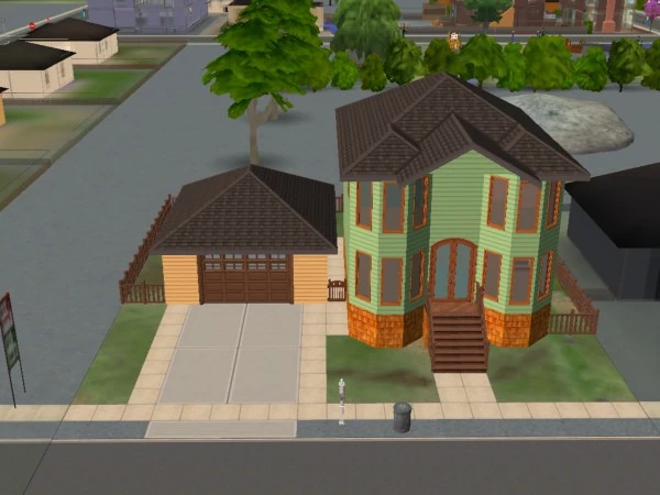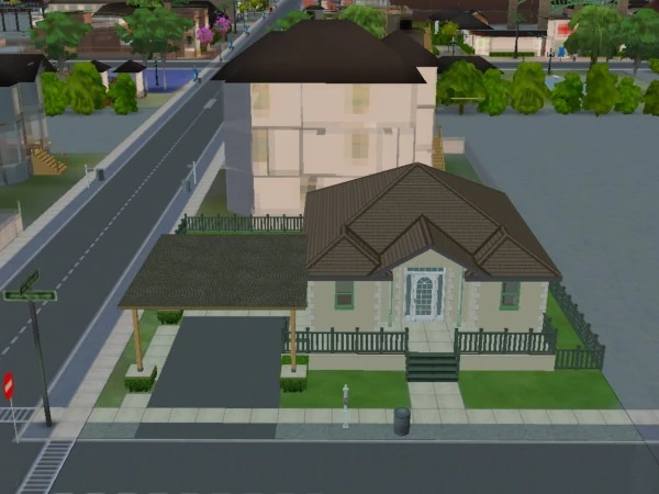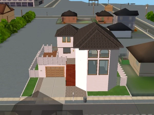 37 Mendoza Lane is a small three-room starter house with a driveway and a fenced backyard. The largest room has a living space with a sofa and a bookshelf, and a medium-sized kitchen. There is a small bathroom positioned next to the kitchen, and a small bedroom with a cheap bed. The backyard has a small, unfurnished patio which can be accessed from a door in the kitchen. Outside of the patio, the backyard is empty with a lawn.