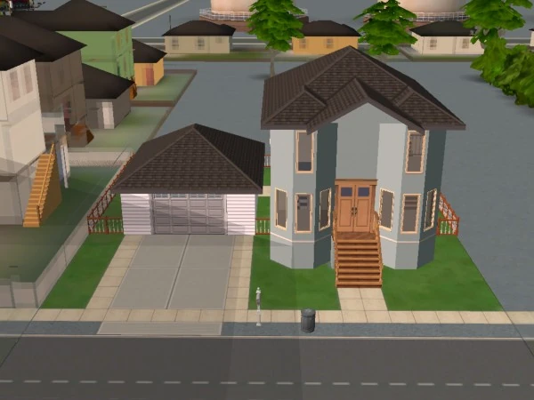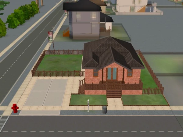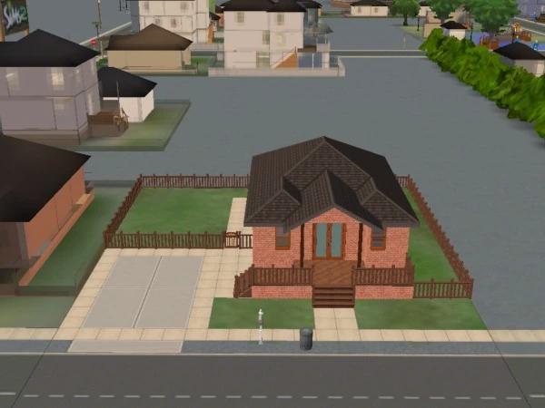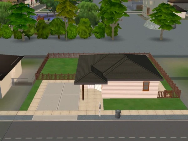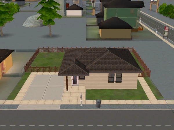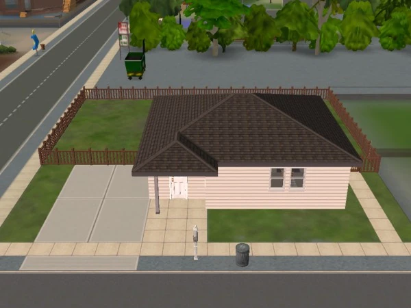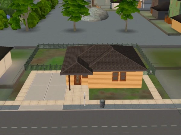 37 Mendoza Lane is a small three-room starter house with a driveway and a fenced backyard. The largest room has a living space with a sofa and a bookshelf, and a medium-sized kitchen. There is a small bathroom positioned next to the kitchen, and a small bedroom with a cheap bed. The backyard has a small, unfurnished patio which can be accessed from a door in the kitchen. Outside of the patio, the backyard is empty with a lawn.