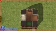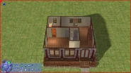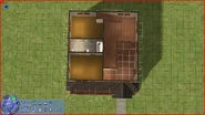 The entrance to this home opens into a room, which is possibly meant as a small living room, dining room, and kitchen. From that room, Sims can enter the bathroom and two more rooms. The kitchen and the bathroom are cheaply furnished.