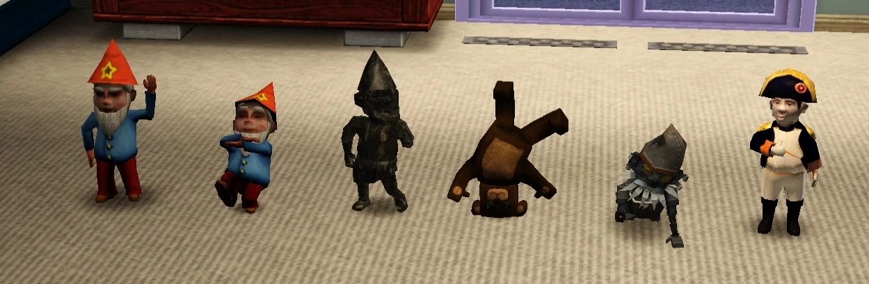 This gnome from The Sims 3: World Adventures is found primarily in Champs Les Sims, France. He can be found when a Sim chooses to "Explore The Catacombs" in the French mausoleum, as a random event while fishing in Champs Les Sims, or by refining metals using the base camp mailbox. He can be found on a display stand, along with the other gnomes from World Adventures, in the Champs Les Sims Museum. This gnome seems to be a caricature of Napoleon Bonaparte.