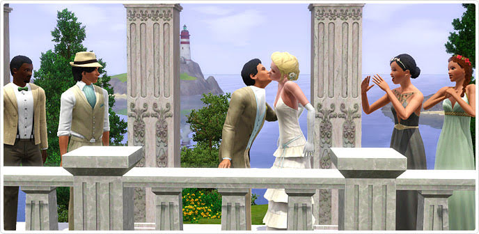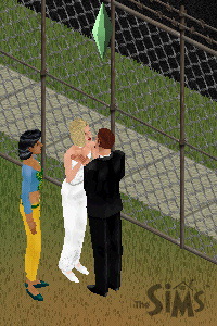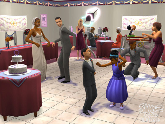 There is a limited number of Sims who can be invited to a wedding party. In The Sims 2, players don't need to invite the bride or the groom to the party if they don't live together, because they will automatically come by themselves. Invited Sims will arrive in Formal wear. When the marriage takes place, both Sims switch into wedding attire (formal wear) and head beneath the wedding arch.[TS2] Guests will gather around, and the Sims exchange vows and kiss to signify their marriage.
