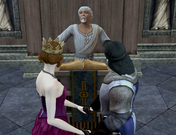 In The Sims Medieval, the interactions leading up to marriage are nearly identical to The Sims 3, but rather with medieval-sounding names. Sims can perform romantic interactions until they have the option to "Ask to Court", which is similar to "Going Steady". After some more relationship-building, Sims can "Ask for Hand in Marriage", which, if successful, will make the two Sims involved engaged. From here, Sims have three options. They can choose to "Get Married Here", which will cause an angel to come down from Heaven and marry the two Sims where they stand, or, if the Sim in control belongs to either the Jacoban or Peteran faith, the two Sims can marry inside their corresponding church. The marriage will not change any Sim's last name or prompt an unplayable Sim to move in—it will only declare the two Sims married.