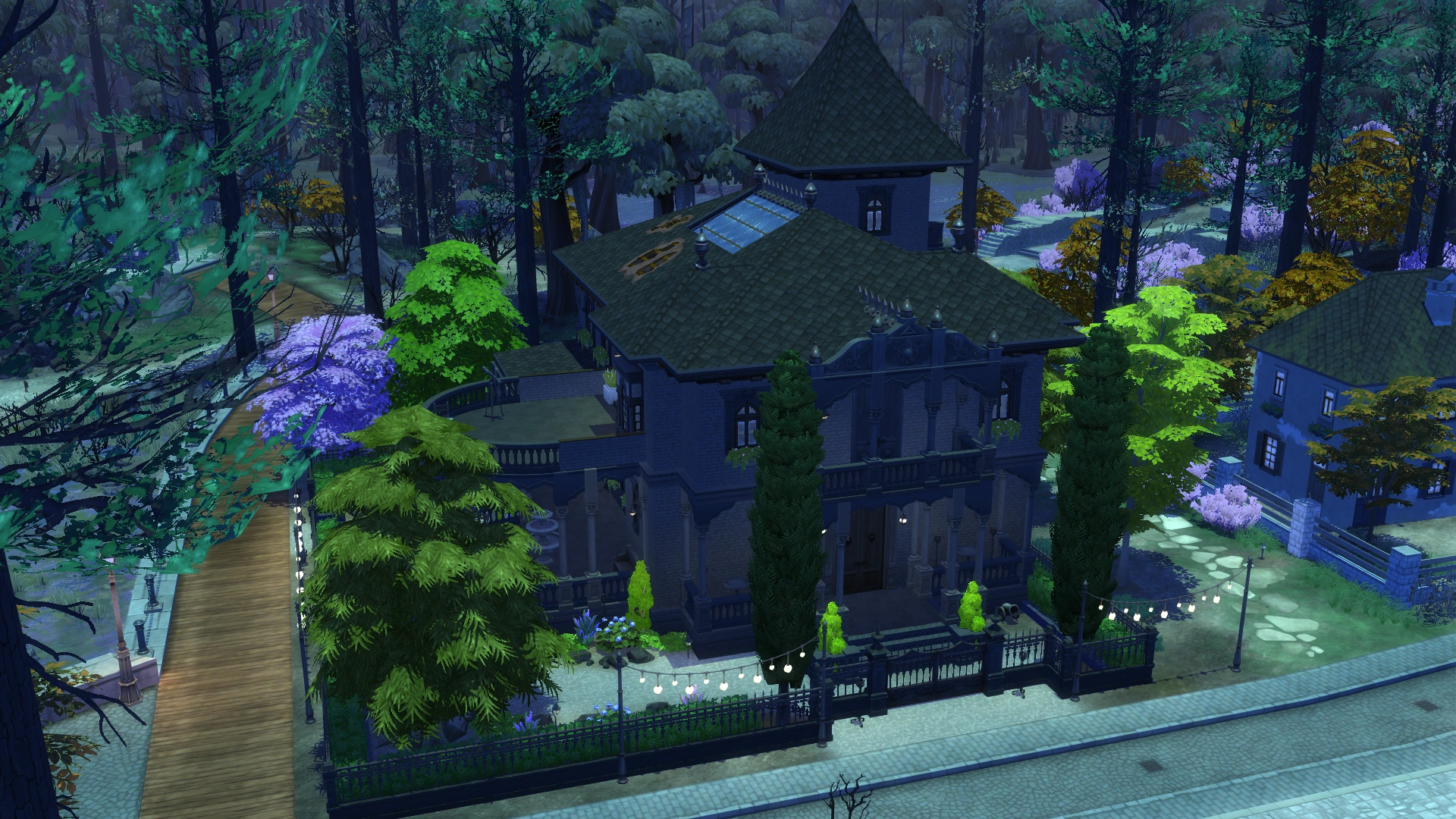 "This green-thumb-friendly manor is conveniently located in central Mourningvale. One of the standout features of this home is the attached greenhouse, which has been converted into a breakfast nook that looks out over the central plaza. This space is perfect home for any Sims interested in gardening...and the afterlife living."
