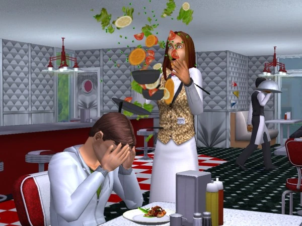 Food preparation and service is simplified compared to restaurants in The Sims: Hot Date. The chef no longer prepares each meal separately. Instead, the server takes the order to the kitchen, and shortly afterward returns to the table or counter with a large covered platter. When this is uncovered, it will contain all the meals that were ordered by Sims at that table. This means that kitchens can be smaller, since they do not need to have refrigerators or places for the chef to put finished meals.