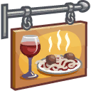 A Sim can eat at the restaurant if the player clicks a podium. The player will have three choices; the type of podium will affect the names and prices of the meals, but not the content. The cheapest choice is just a salad, the second choice is a salad followed by a plate of steak and beans, and the most expensive choice adds a dessert.