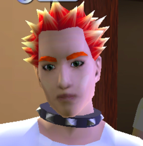 In The Sims Bustin' Out, he lives at 2 Free Street with Peter, Woody, and Ziggy. In The Sims, he has a fourth roommate, Randy, who is absent from the Bustin' Out version. In this game, he dresses a bit differently. He wears a white shirt, green pants, and a choker necklace. He also has a red spikey haircut. As for his personality, he is a bit rude at first, but once your Sim gets to know him, he is a true friend.