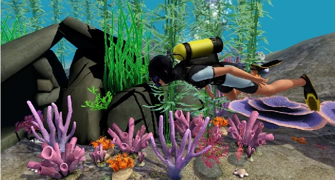 There are 4 diving areas in Isla Paradiso. Each diving area has scuba diving skill requirement. One of the diving areas is first available to Sims when they reach the Scuba Diving skill level 2, being Rocky Reef, then level 4 Davy Jones' Locker, level 7 Mermaid Grotto and level 9 Pearl's Deep. Once the Sim boats or swims to above the dive lot, Sims with sufficient Scuba Diving skill can scuba dive underwater. The lots are decorated with many rocks, coral and other objects. There are also gems and fish on the lot that can be caught, underwater caves to explore, and the treasure to discover. Mermaids can also often be seen and socialized with at the various dive lots.