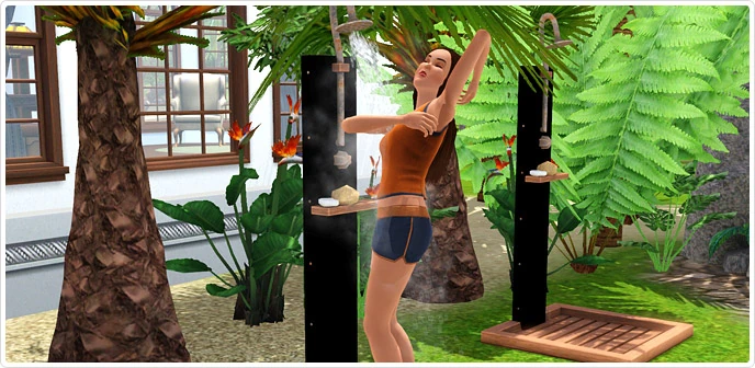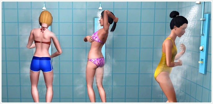 Outdoor Retreat, Spa Day, Discover University, Snowy Escape and Lovestruck include showers which do not violate privacy for Sims aged young adult and older. Sims will not shoo other Sims away before using them, but they may become embarrassed if other Sims are in the same room. Some showers also remain functional when a lot is off-the-grid.