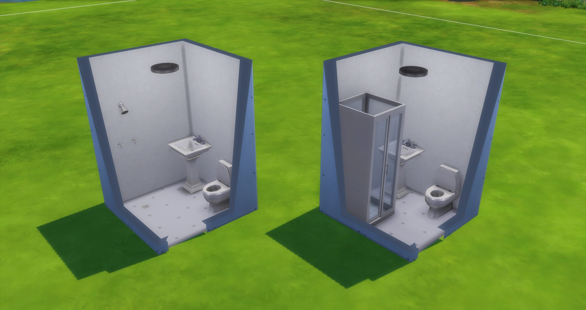 Island Paradise, Movie Stuff and Into the Future include all-in-one bathrooms, which function as a combination of a shower and a toilet. Sims enter fully clothed, and they do not violate privacy.