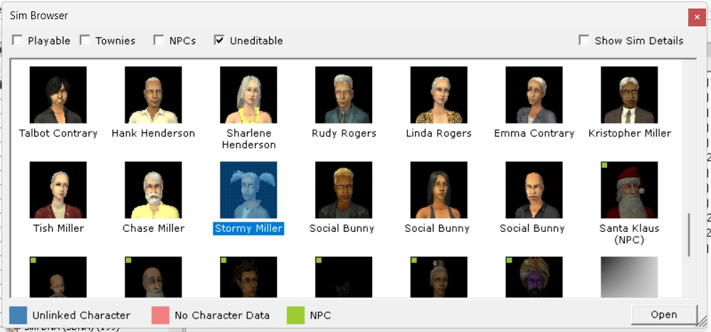 However, all Desiderata Valley Social Bunnies must be manually moved to the NPC Sim Bin using SimPE in order for them to show up in-game, since none of them are placed in the NPC Sim Bin at the start of the game.