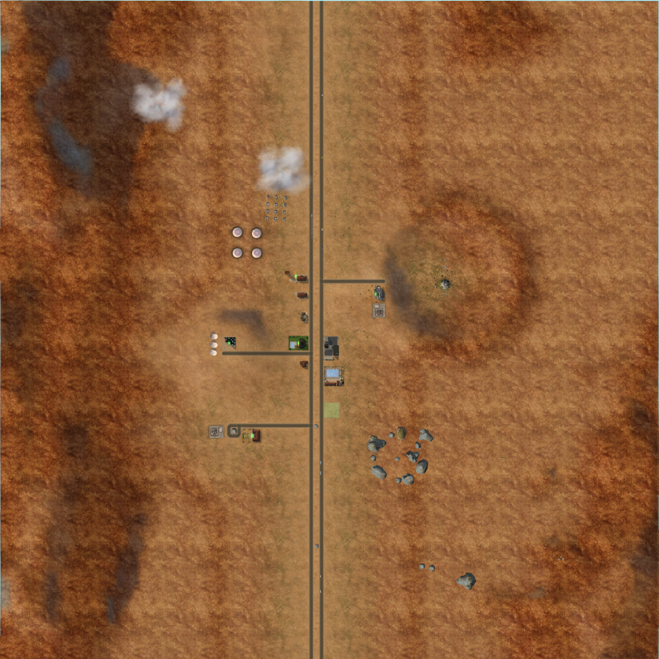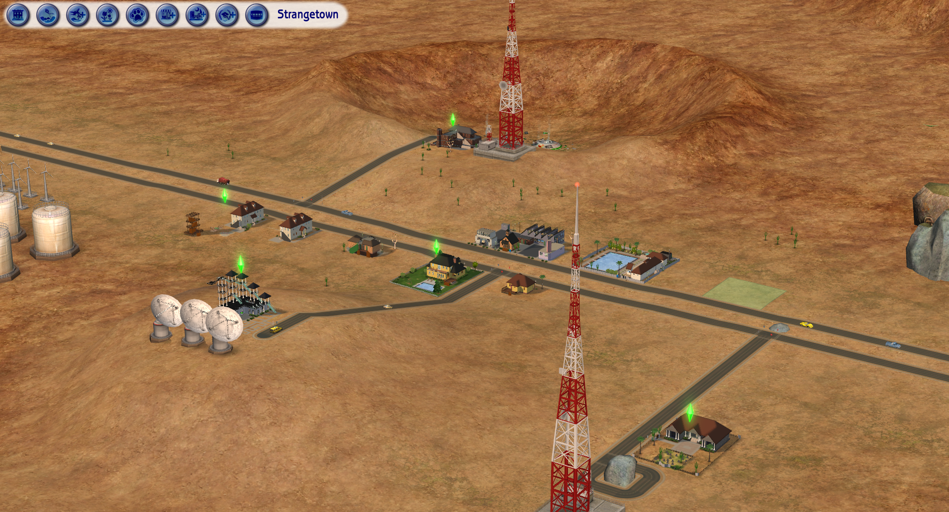 Strangetown only features two community lots, placed right next to each other; a large swimming pool, and at what appears to be decommissioned military buildings and a church, repurposed to be Strangetown's only clothing, grocery and bookstores. The every residential lot, except three are placed in a row next to each other, on the opposite side of the road from the community lots, On the outskirts of town is a large crater, with the broken remains of a U.F.O buried in the middle.