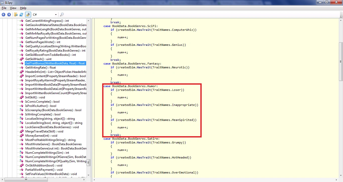 As you can see on the right, it is the code that presents which bonus traits certain genres have. I marked the Humor genre in red square. Only Loser, Inappropriate, and Mean Spirited counts; Good Sense of Humor doesn't count. Each bonus trait a Sim possesses, they get an extra 25% for the book's royalty, so possessing these 3 traits will give +75% bonus royalty. Having the Good Sense of Humor trait only helps Sims to write the genre with less Writing skill, but it doesn't grant the royalty bonus. So even though Good Sense of Humor trait is helpful, putting it under "Bonus Traits" column is also incorrect, since the context of benefit is different.