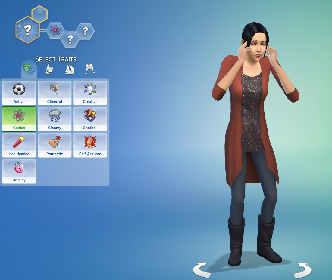| Genius | These Sims tend to be Focused, can Share Ideas with other Sims, and may become upset if they haven't improved their Mental Skills for some time. | ||