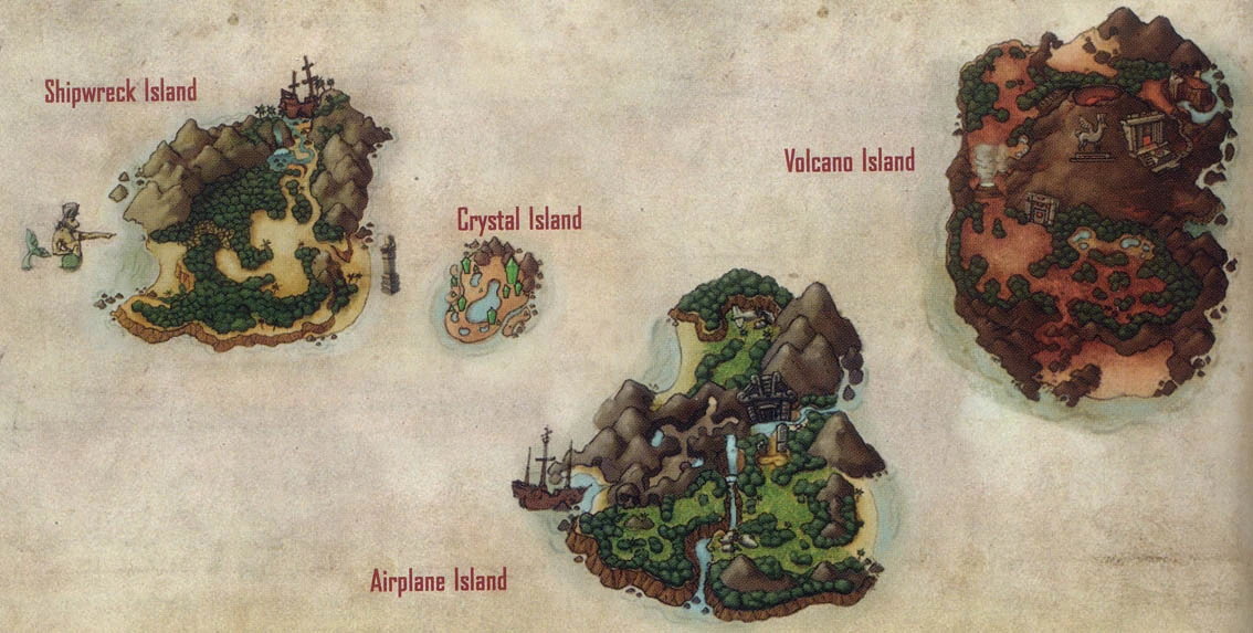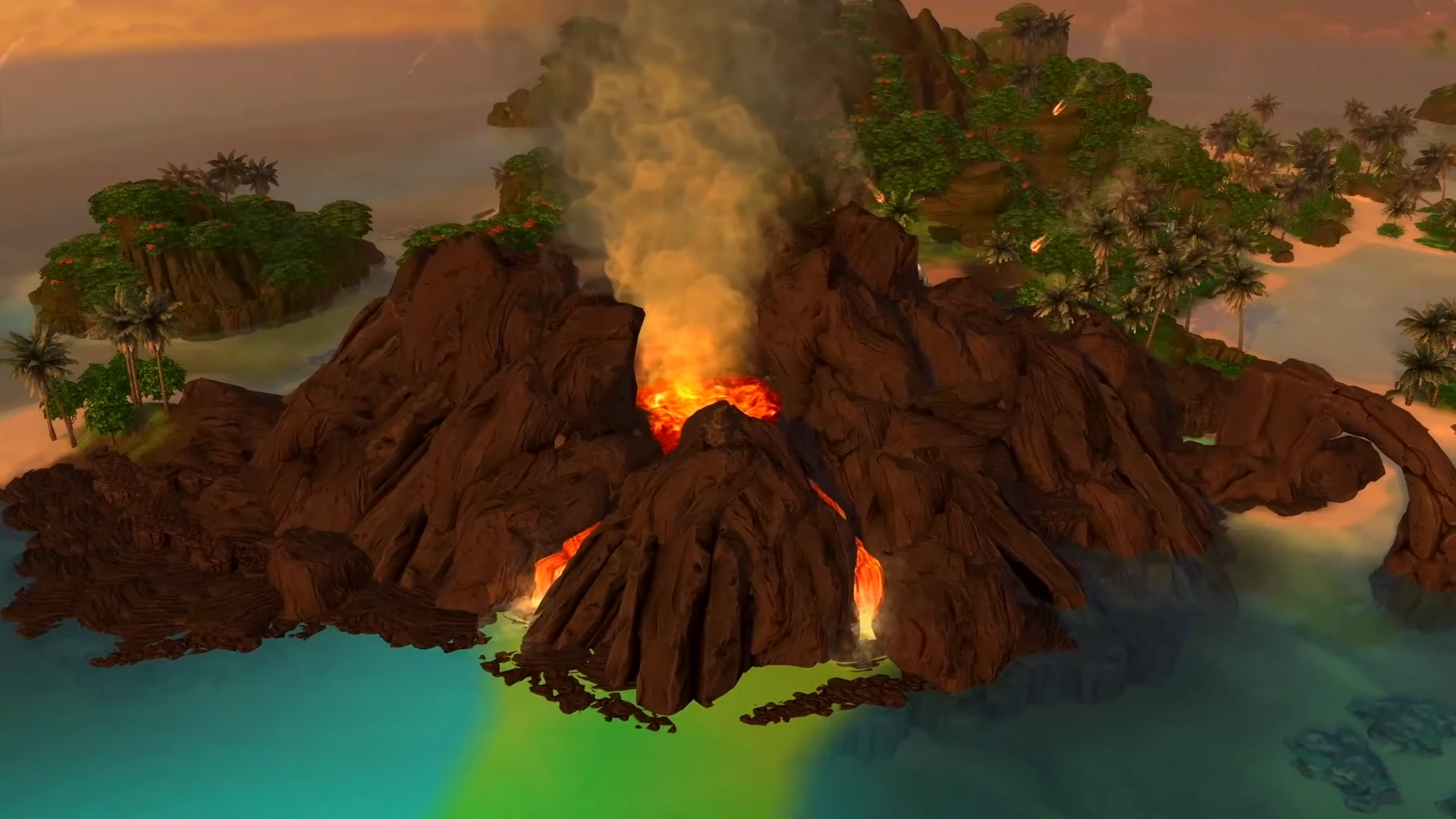 The rightmost island in the archipelago, Volcano Island, shows a central tall volcano with magma inside.