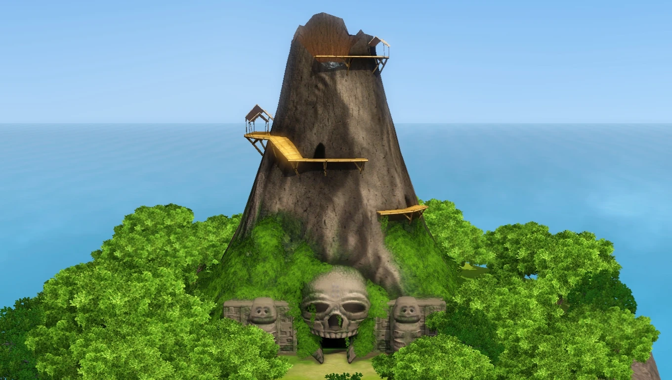 The atoll contains a very large mountain on one end, with an abandoned warehouse on top. Though lava can be seen bubbling inside the crater, the volcano does not appear to be active.