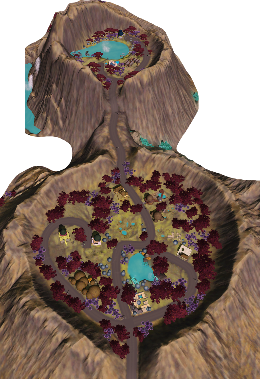 Lunar Lakes appears to have two tall mountains with volcano-like craters in them. Besides a couple lakes in them, the volcanos appear to have become dormant well in advance of the Lunar Lakes settlement arriving on that plant.
