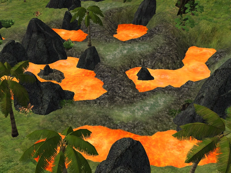The Lava Pools on Volcano Island, just south of the main Felicity Island, contain densely placed lava lakes. The islands' general volcano network erupts frequently.