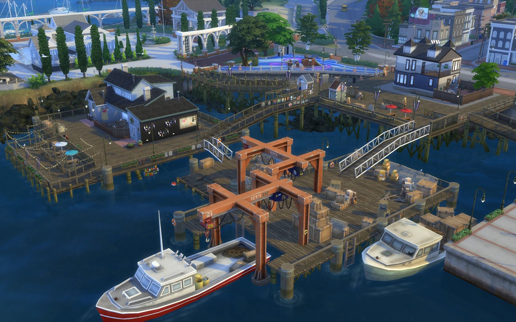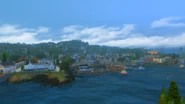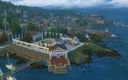 Whiskerman's Wharf is located on the waterfront, hosting a big pier full of food stalls, picnic tables and various fishing spots, along with boxes and other high areas where cats can jump up to. A special boat is also located in the pier, that Sims can use as a quick access to Deadgrass Isle. A pirate jungle gym for children is also located near the main pier.